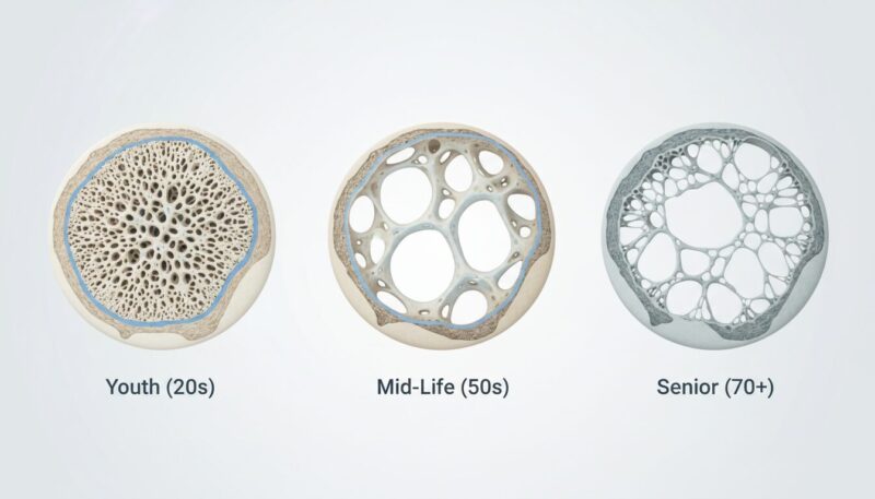 男性には閉経がないため、女性のように急激な骨量低下は起こりにくいものの、加齢とともに確実に骨密度は減少していきます。20歳頃に最大骨量を迎えた後、骨量はほぼ横ばいで推移しますが、50代頃から徐々に減少が見られるようになります。